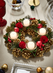 Palette: a blend of festive colours and cool winter tones – deep green, red, gold, white.